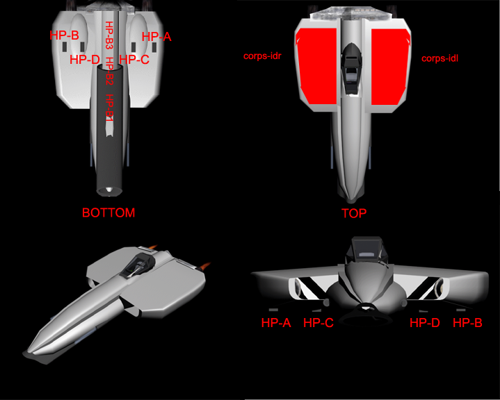 ................ + ..............+ .1. + ............+---------+ ..........+......!......+ ..........+2.... !.....3+ ...........+-----!-----+ ............+4---!---5+ ...............+++++ 1-Cockpit 2-L Body (Controls) 3-R Body (Controls) 4-L Engine 5-R Engine |